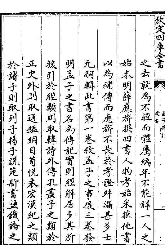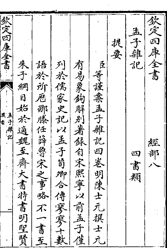 之去就为不轻而体属编年不能详一人之始末明薛应旂撰四书人物考始采摭他书以为补传而应旂不长于考證舛漏甚多士元嗣辑此书第一卷叙孟子之事后三卷发明孟子之书名为传记实则经解居多其所援引于经类则取韩诗外传孔丛子之类于正史外则取通鉴纲目荀悦袁宏汉纪之类于诸子则取列子扬子说苑新书盐铁论之提要 第 2a 页 WYG0207-0290a.png
