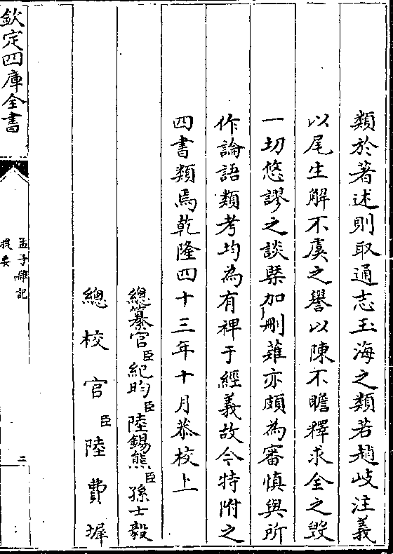 类于著述则取通志玉海之类若赵岐注义以尾生解不虞之誉以陈不瞻释求全之毁一切悠谬之谈槩加删薙亦颇为审慎与所作论语类考均为有裨于经义故今特附之四书类焉乾隆四十三年十月恭校上总纂官(臣)纪昀(臣)陆锡熊(臣)孙士毅