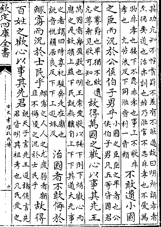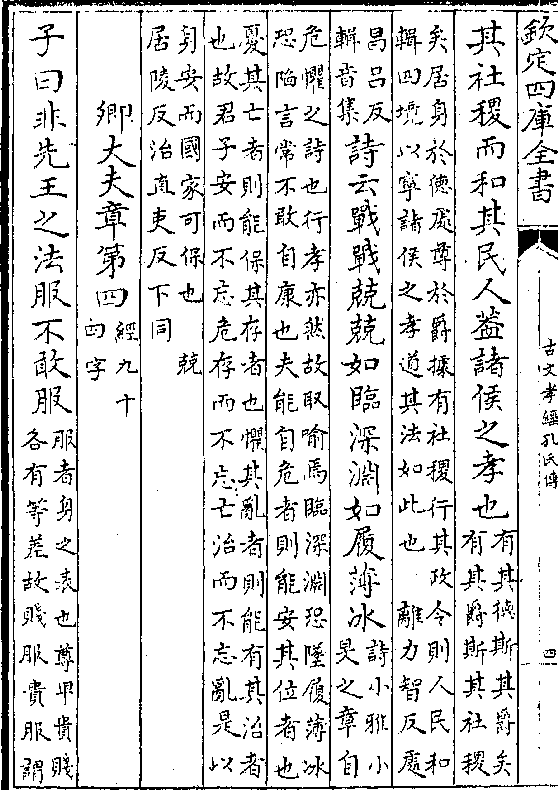 其社稷而和其民人盖诸侯之孝也(有其德斯其爵矣/有其爵斯其社稷)(矣居身于德处尊于爵据有社稷行其政令则人民和/辑四境以宁诸侯之孝道其法如此也 离力智反处)