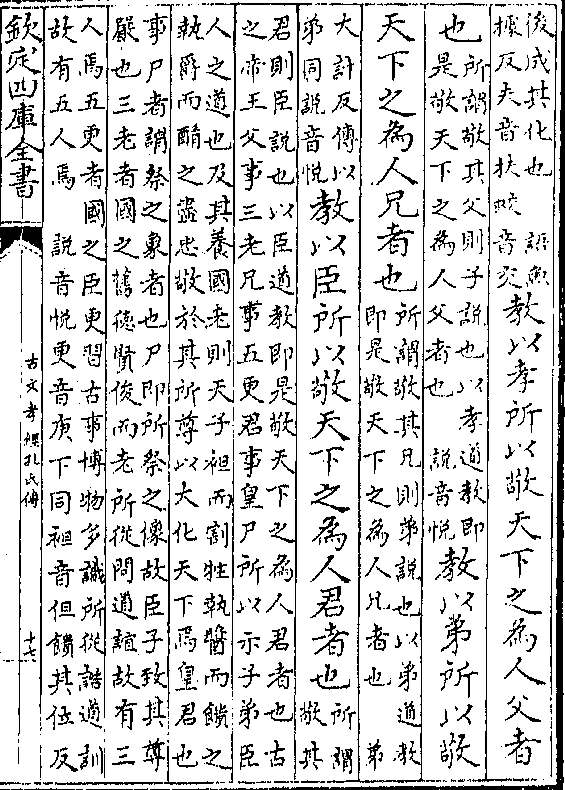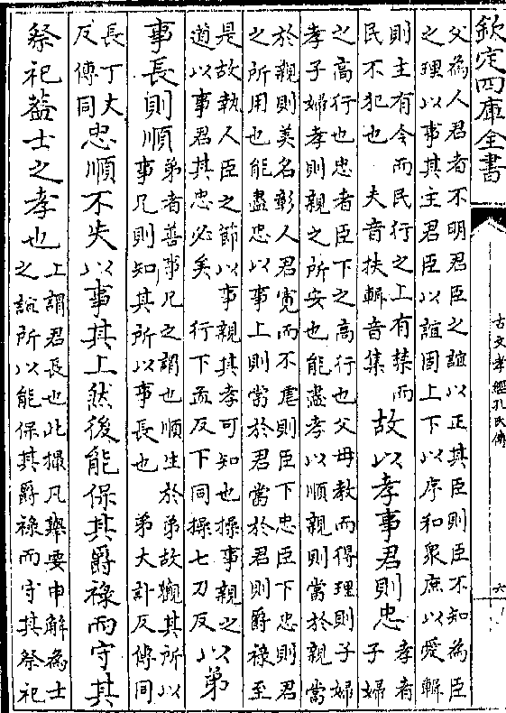 (父为人君者不明君臣之谊以正其臣则臣不知为臣/之理以事其主君臣以谊固上下以序和众庶以爱辑)(则主有令而民行之上有禁而/民不犯也 夫音扶辑音集)故以孝事君则忠(孝者/子妇)