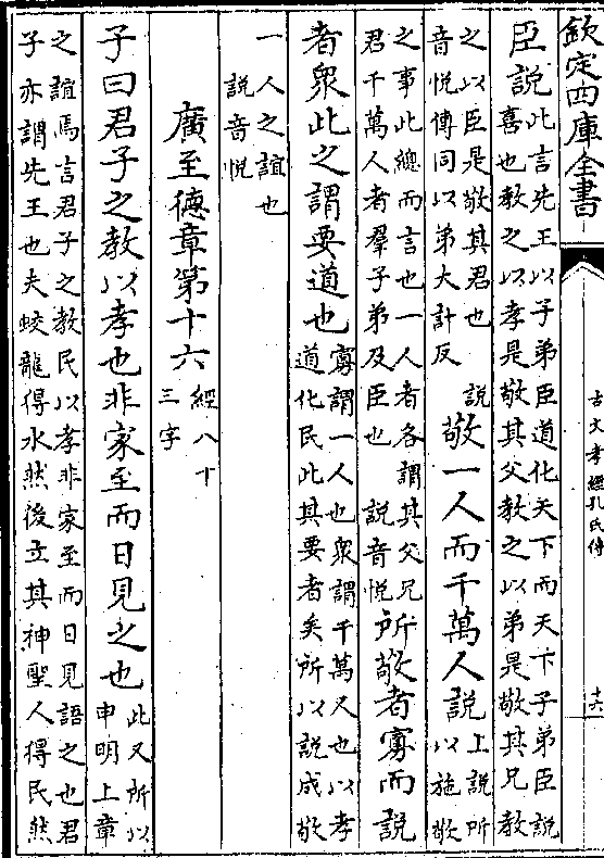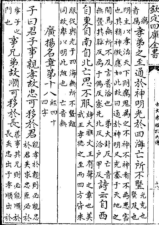 (音疠/ 厉)孝弟之至通于神明光于四海亡所不暨(光充也/暨及也)(明主以孝治天下则疠鬼为之不神不神者不为患害/也其精神徵应如此故曰通于神明又充塞于天地之)