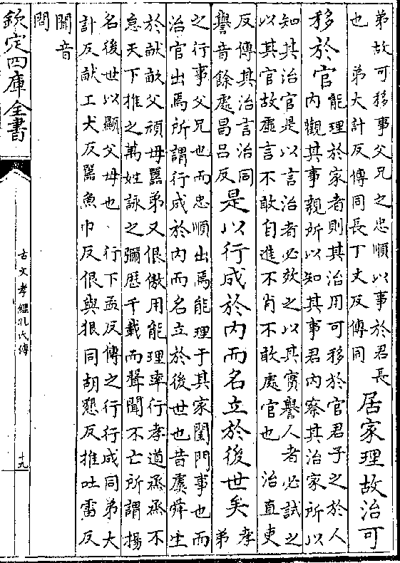 (弟故可移事父兄之忠顺以事于君长/也 弟大计反传同长丁丈反传同)居家理故治可移于官(能理于家者则其治用可移于官君子之于人/内观其事亲所以知其事君内察其治家所以)