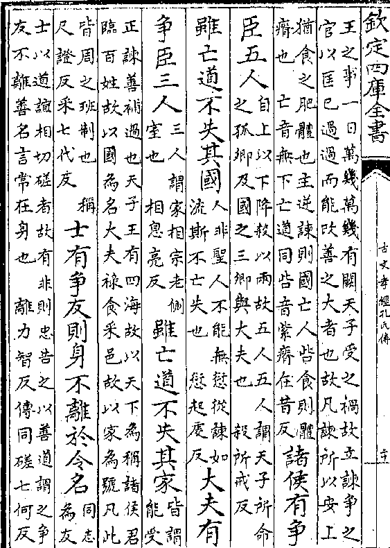 (王之事一日万几万几有阙天子受之祸故立谏争之/官以匡已过过而能改善之大者也故凡谏所以安上)(犹食之肥体也主逆谏则国亡人呰食则体/瘠也 亡音无下亡道同呰音紫瘠在昔反)诸侯有争