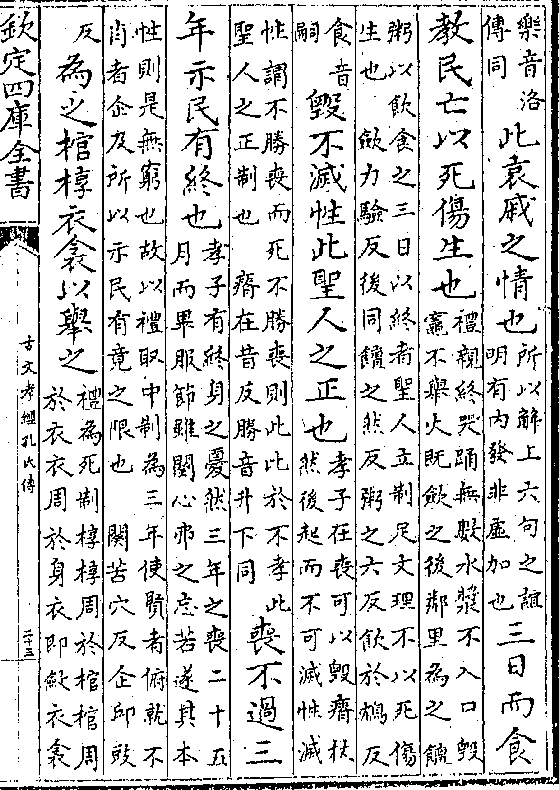 (乐音洛/传同)此哀戚之情也(所以解上六句之谊/明有内发非虚加也)三日而食教民亡以死伤生也(礼亲终哭踊无数水浆不入口毁/灶不举火既敛之后邻里为之饘)