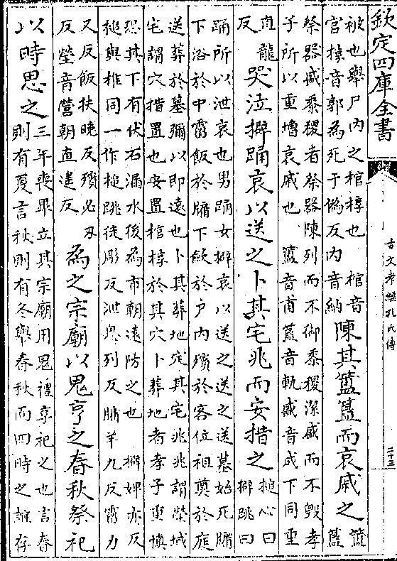 (被也举尸内之棺椁也内棺音/官椁音郭为死于伪反 音纳)陈其簠簋而哀戚之(簠/簋)(祭器盛黍稷者祭器陈列而不御黍稷洁盛而不毁孝/子所以重增哀戚也 簠音甫簋音轨盛音成下同重)