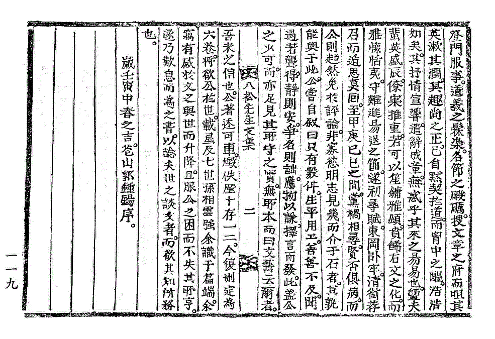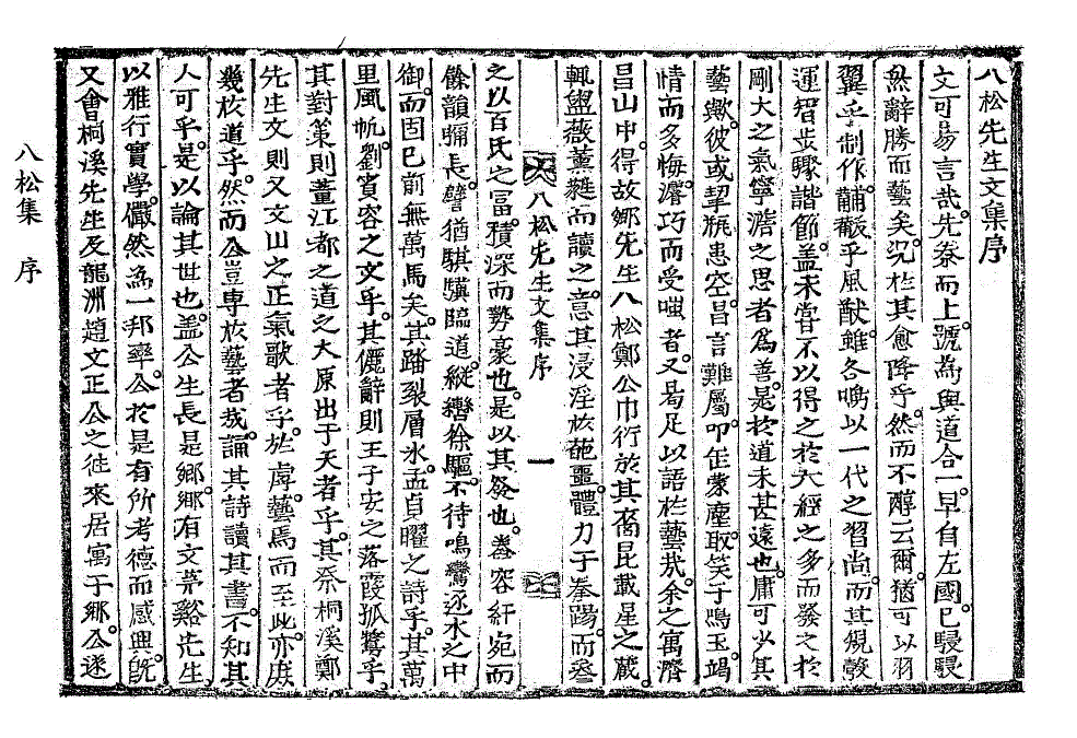 文可易言哉。先秦而上。号为与道合一。早自左国。已骎骎然辞胜而艺矣。况于其愈降乎。然而不醇云尔。犹可以羽翼乎制作。黼黻乎风猷。虽各鸣以一代之习尚。而其规彀运智步骤谐节。盖未尝不以得之于六经之多而发之于刚大之气宁澹之思者为善。是于道未甚远也。庸可少其艺欤。彼或挈瓶患空。昌言难属。叩缶蒙尘。取笑于鸣玉。竭情而多悔。浚巧而受嗤者。又曷足以语于艺哉。余之寓济昌山中。得故乡先生八松郑公巾衍于其裔昆载星之藏。辄盥薇薰蕤而读之。意其浸淫于葩噩。体力于拳踢。而参之以百氏之富。积深而势豪也。是以其发也。舂容纡宛而馀韵弥长。譬犹骐骥临道。纵辔徐驱。不待鸣鸾逐水之中御。而固已前无万马矣。其踏裂层冰。孟贞曜之诗乎。其万里风帆。刘宾容之文乎。其俪辞则王子安之落霞孤鹜乎。其对策则蕫江都之道之大原出于天者乎。其祭桐溪郑先生文则又文山之正气歌者乎。于虖。艺焉而至此。亦庶几于道乎。然而公岂专于艺者哉。诵其诗读其书。不知其人可乎。是以论其世也。盖公生长是乡。乡有文茅溪先生。以雅行实学。俨然为一邦率。公于是有所考德而感兴。既又会桐溪先生及龙洲赵文正公之往来居寓于乡。公遂