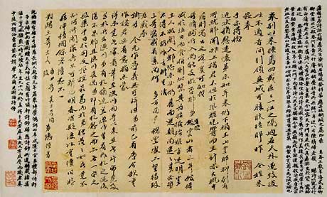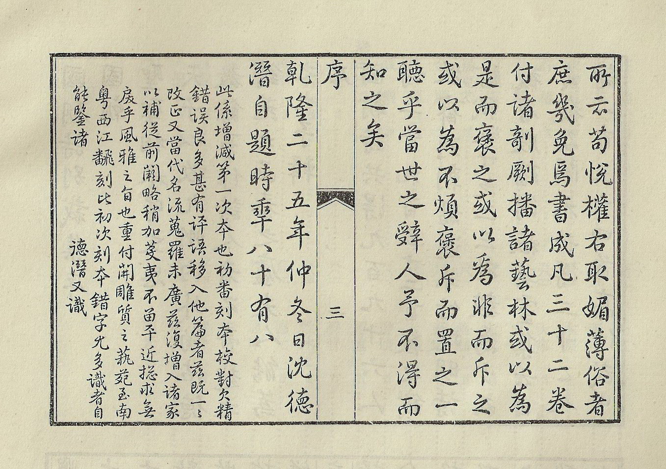 诗古文书窗所夙嗜,践祚以来,万机鲜暇,虽时寄兴吟咏,而古文不数数为之,是序构思染翰,至四刻始就,非复有曩日弓燥手柔之乐,况能津逮古人耶?归愚叟于近代诗家,视青邱、渔洋殆有过之无不及者,故乐为之序,不复计其工拙迟速。书卷以赐。岁云暮矣,封事稍稀,更偿文债,亦足为艺林增一胜事也。乾隆辛未小除夜书于坤宁宫之东阁。